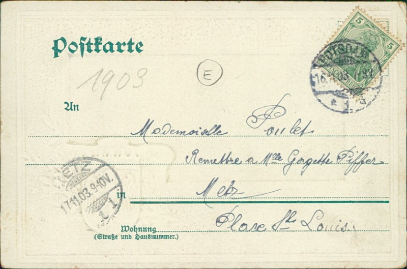Alte Ansichtskarte aus Potsdam, gelaufen am 16.11.1903 von Potsdam nach Metz. Ankunft in Metz am 17.11.1903.