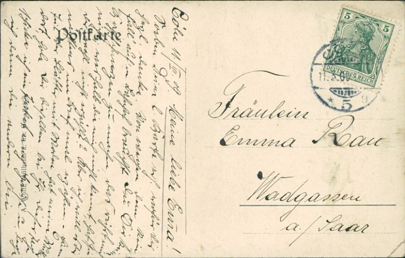 Alte Ansichtskarte aus Köln, gelaufen am 11.03.1909 von Cöln nach Wadgassen a./Saar.