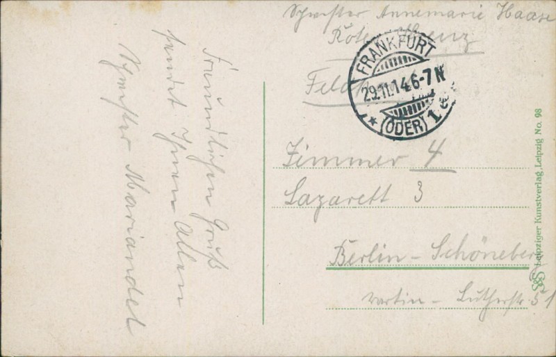 Alte Ansichtskarte aus Frankfurt (Oder), gelaufen am 29.11.1914 von Frankfurt (Oder) nach Berlin-Schöneberg.