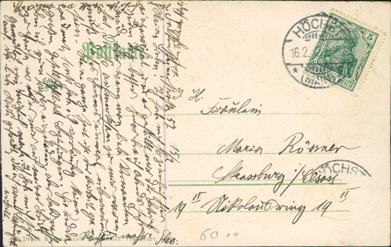 Alte Ansichtskarte aus Frankfurt-Höchst, gelaufen am 16.02.1912 von Höchst (Main) nach Strassburg i/Elsass.