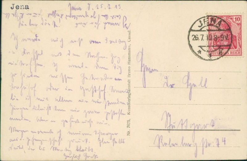 Alte Ansichtskarte aus Jena, gelaufen am 26.07.1919 von Jena nach Stuttgart.