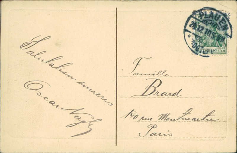 Alte Ansichtskarte aus Plauen, gelaufen am 28.12.1910 von Plauen (Vogtland) nach Paris.