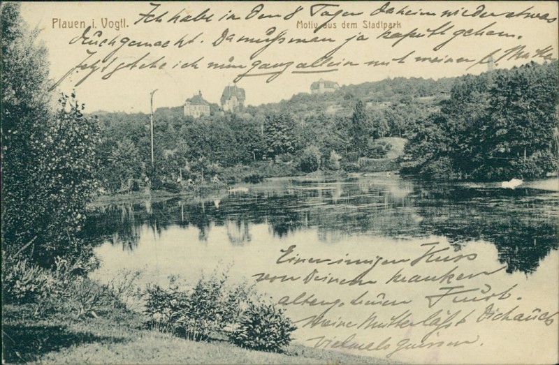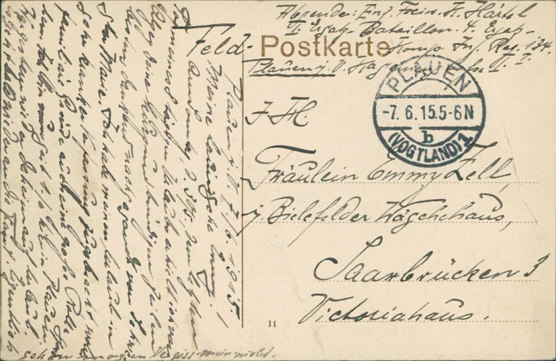 Alte Ansichtskarte aus Plauen, gelaufen am 07.06.1915 von Plauen (Vogtland) nach Saarbrücken 3.