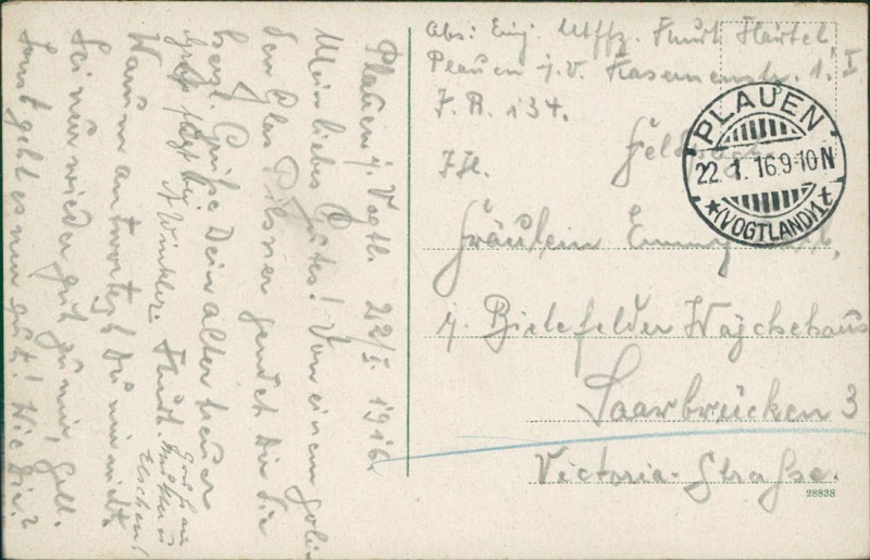 Alte Ansichtskarte aus Plauen, gelaufen am 22.01.1916 von Plauen (Vogtland) nach Saarbrücken 3.