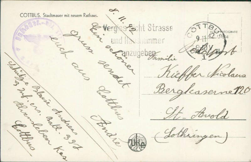 Alte Ansichtskarte aus Cottbus, gelaufen am 09.11.1942 von Cottbus nach St. Avold.