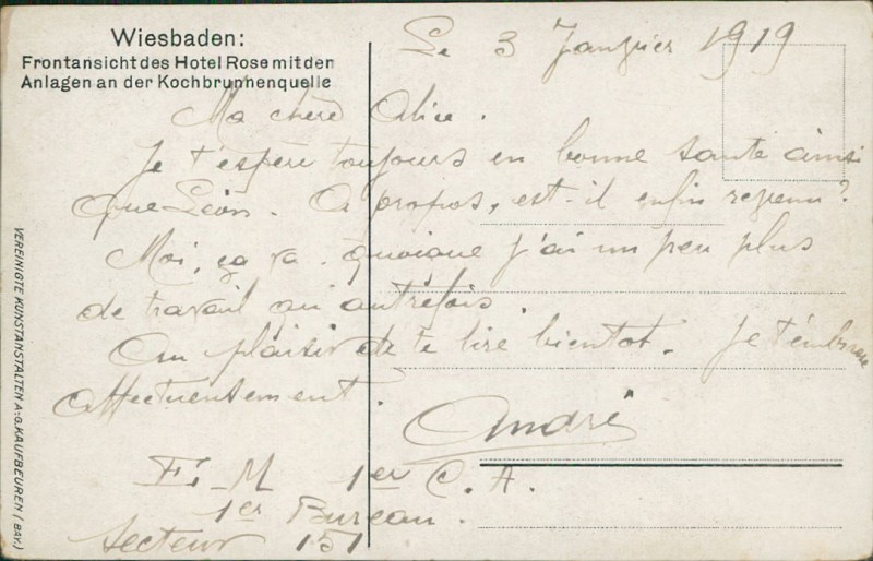 Alte Ansichtskarte aus Wiesbaden, beschrieben am 03.01.1919.