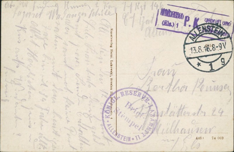 Alte Ansichtskarte aus Allenstein / Olsztyn, gelaufen am 13.08.1916 von Allenstein nach Mülhausen.