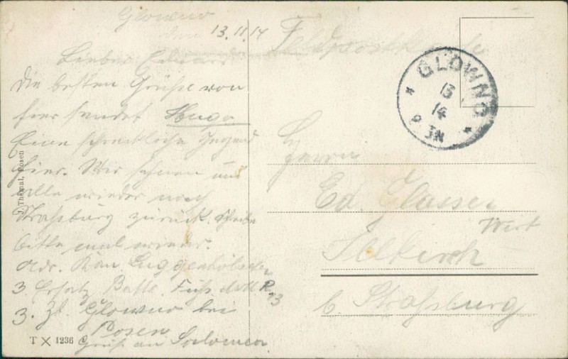 Alte Ansichtskarte aus Posen / Pozna, gelaufen am 13.11.1914 von Glöwno nach Illkirch.