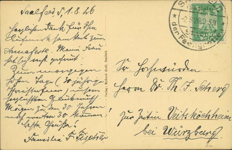 Alte Ansichtskarte aus Saalfeld/Saale, gelaufen am 02.08.1926 von Saalfeld nach Veitshöchheim.