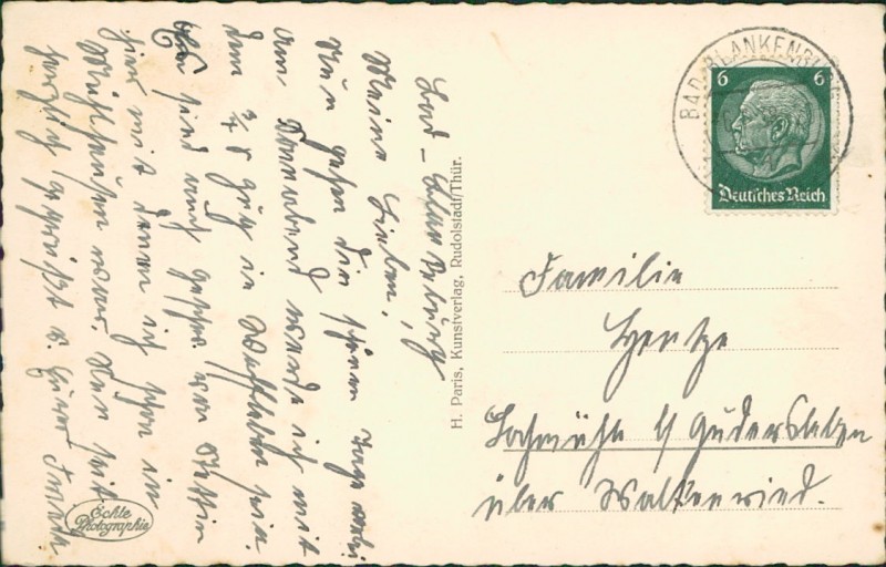 Alte Ansichtskarte aus Bad Blankenburg, gelaufen am 06.07.1938 von Bad Blankenburg nach H. Paris, Kunstverlag, Rudolstadt/Thür.