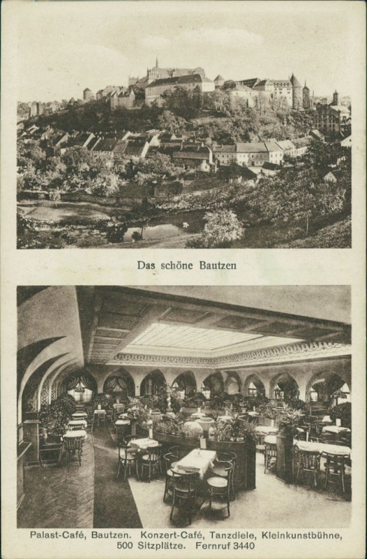 Teilansicht, Palast-Café, Konzert-Café, Tanzdiele, Kleinkunstbühne, 500 Sitzplätze. Fernruf 3440