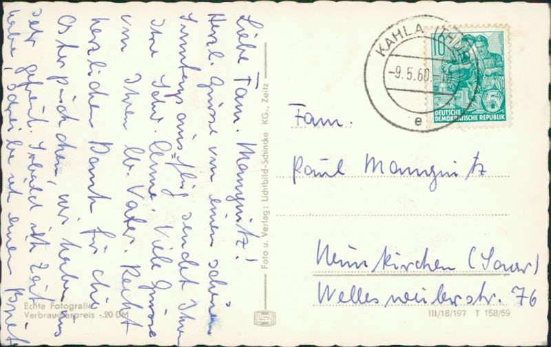 Alte Ansichtskarte aus Kahla, gelaufen am 09.05.1960 von Kahla (Thür) nach Neunkirchen (Saar).