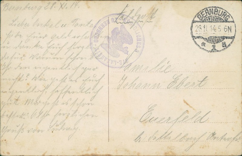Alte Ansichtskarte aus Bernburg (Saale), gelaufen am 28.11.1914 von Bernburg nach Euerfeld.