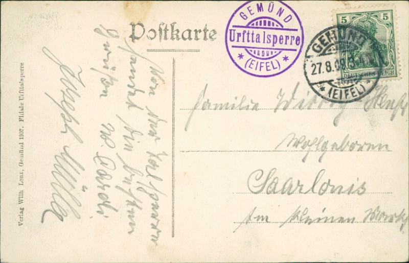 | Verlag | Wilh Lenz, Gemünd 1907. Filiale Urfttalsperre |