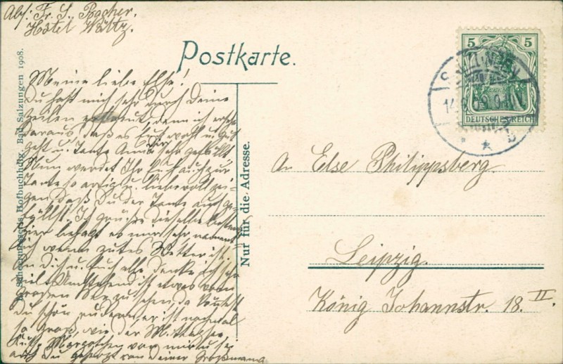 Alte Ansichtskarte aus Bad Salzungen, gelaufen am 14.06.1909 von Salzungen nach Leipzig.