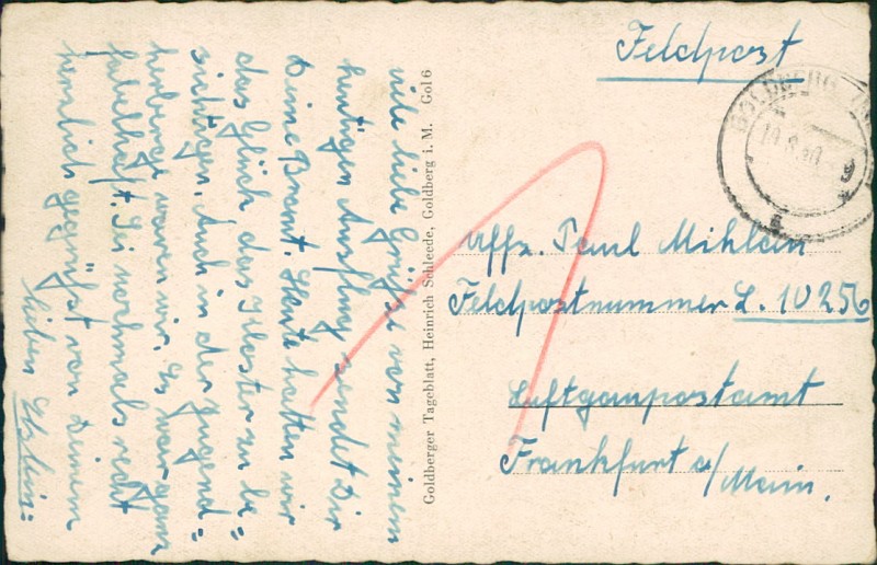 Alte Ansichtskarte aus Goldberg-Mildenitz Dobbertin, gelaufen am 19.03.1940 von Goldberg nach Frankfurt a/Main.