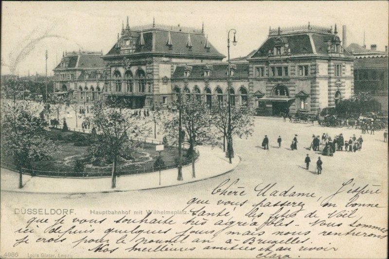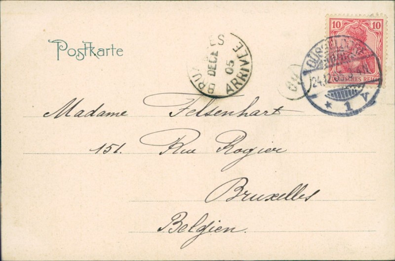 Alte Ansichtskarte aus Düsseldorf, gelaufen am 24.12.1905 von Düsseldorf nach Bruxelles.