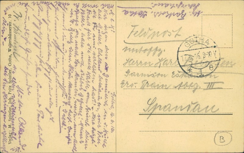 Alte Ansichtskarte aus Gotha, gelaufen am 17.06.1916 von Gotha nach Spandau.