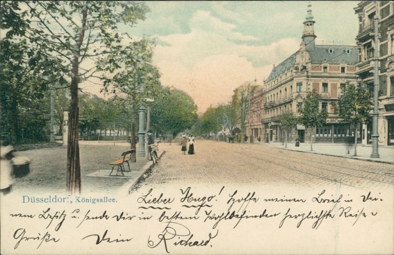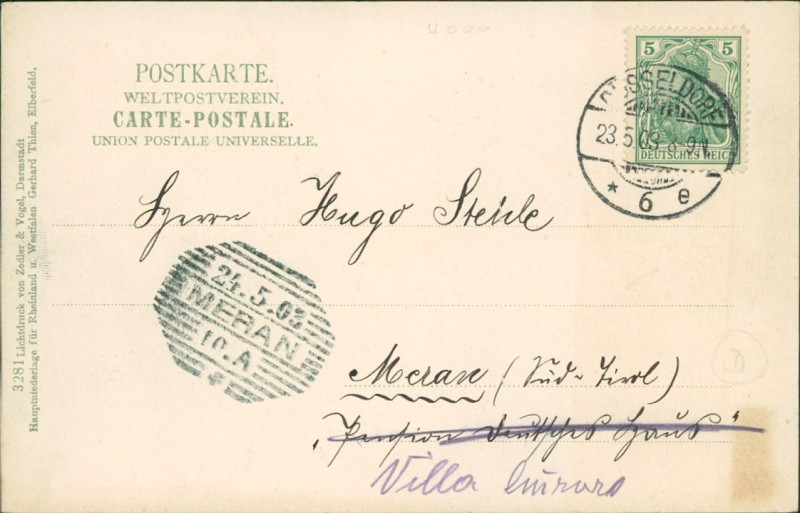 Alte Ansichtskarte aus Düsseldorf, gelaufen am 23.05.1903 von Düsseldorf nach Meran. Ankunft in Meran am 24.05.1903.