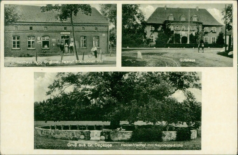 Gasthaus Willy Griebner, Fernruf Stallupönen 520, Gutshaus, Heldenfriedhof mit Napoleons-Eiche