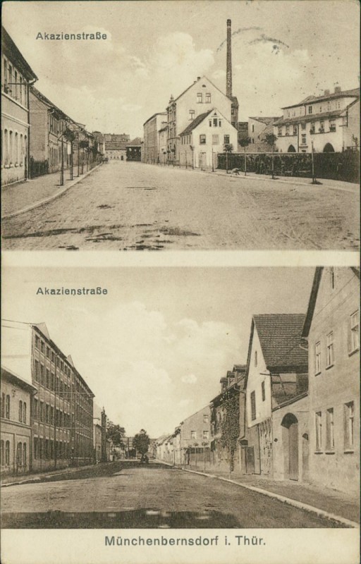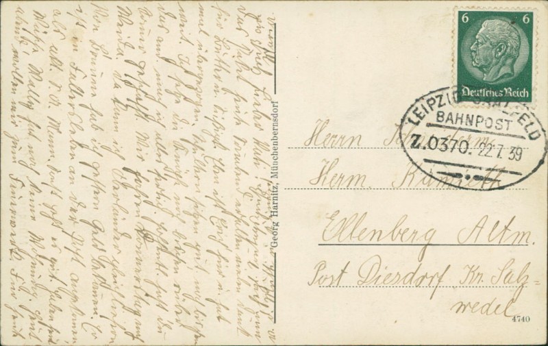 Alte Ansichtskarte aus Münchenbernsdorf, gelaufen am 22.07.1939 von Leipzig-Saalfeld (Bahnpost) nach Ellenberg.