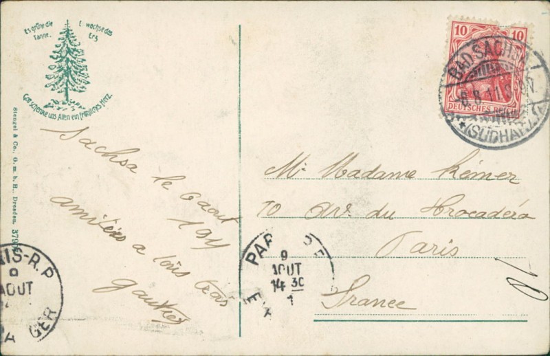 Alte Ansichtskarte aus Bad Sachsa, gelaufen am 08.08.1911 von Bad Sachsa nach Paris.