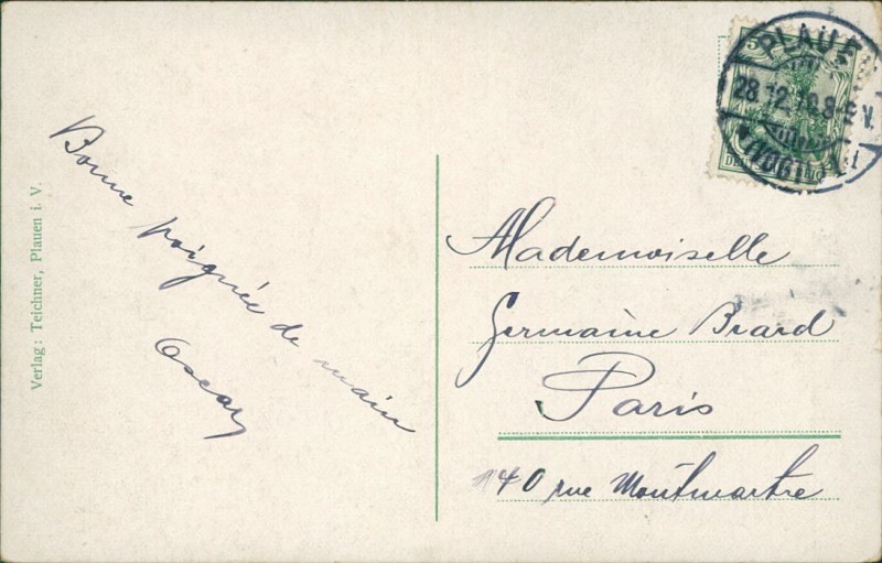 Alte Ansichtskarte aus Pöhl, gelaufen am 28.12.1910 von Plauen nach Paris.