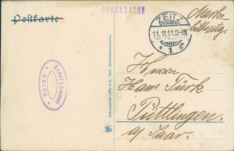 Alte Ansichtskarte aus Eisenberg, gelaufen am 11.11.1911 von Zittau nach Püttlingen.