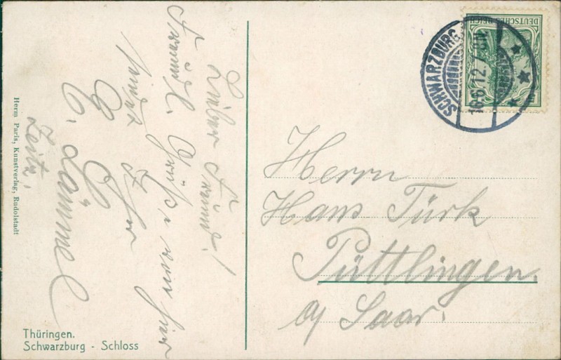 Alte Ansichtskarte aus Schwarzburg, gelaufen am 16.06.1912 von Schwarzburg nach Püttlingen.