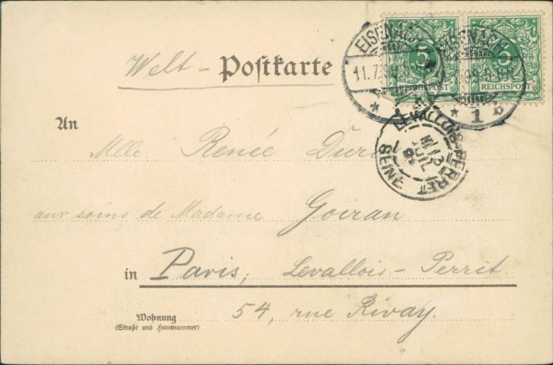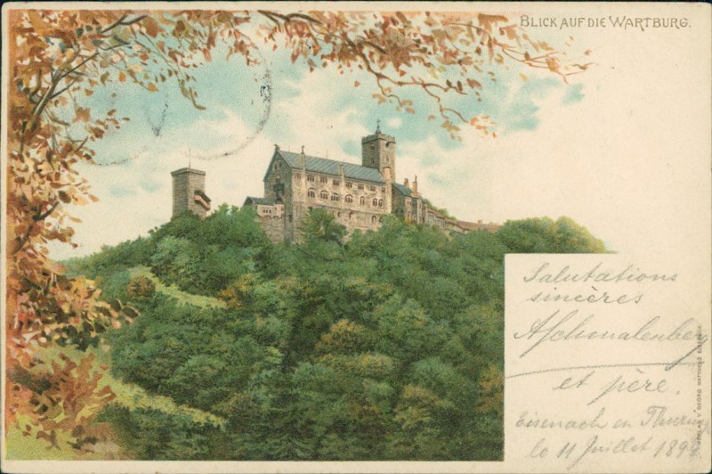 Alte Ansichtskarte aus Eisenach, gelaufen am 11.07.1899 von Eisenach nach Paris.