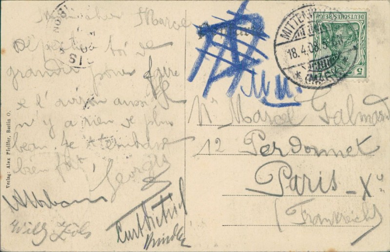 Alte Ansichtskarte aus Mittenwalde, gelaufen am 18.04.1908 von Mittenwalde nach Paris.