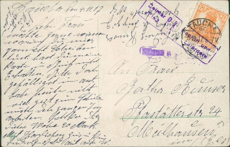 Alte Ansichtskarte aus Taucha, gelaufen am 05.11.1917 von Taucha nach Mülhausen im/Els.