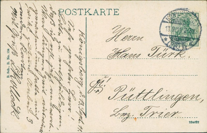Alte Ansichtskarte aus Zinten / Kornewo, gelaufen am 13.09.1911 von Königsberg (Pr.) nach Püttlingen.