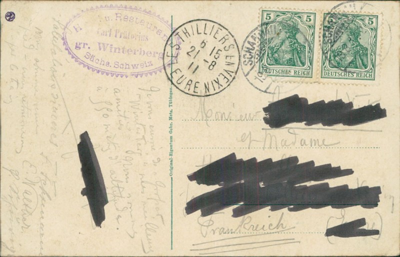 Alte Ansichtskarte aus Bad Schandau, gelaufen am 19.08.1911 von Schandau nach Les Thilliers en Vexin. Ankunft in Les Thilliers en Vexin am 21.08.1911.