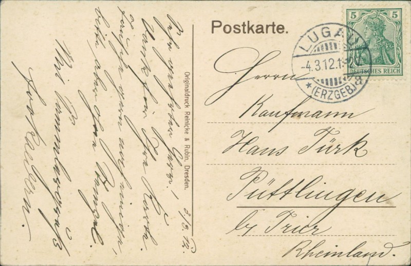 Alte Ansichtskarte aus Oelsnitz/Erzgeb., gelaufen am 04.03.1912 von Lugau (Erzgeb.) nach Püttlingen.