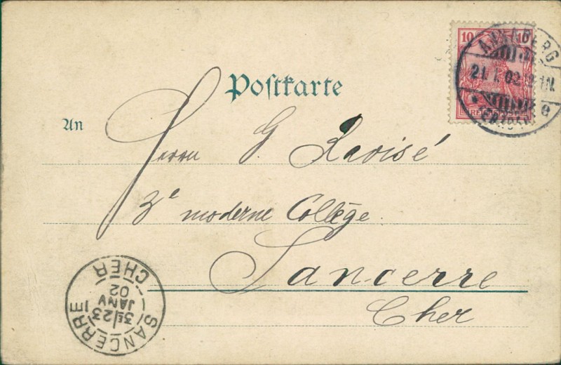 Alte Ansichtskarte aus Annaberg-Buchholz, gelaufen am 21.01.1902 von Annaberg nach Sancerre. Ankunft in Sancerre am 23.01.1902.
