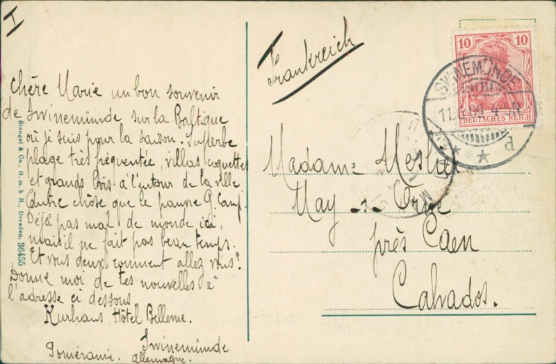 Alte Ansichtskarte aus Swinemünde / Świnoujście, gelaufen am 11.06.1909 von Swinemünde nach Caen.