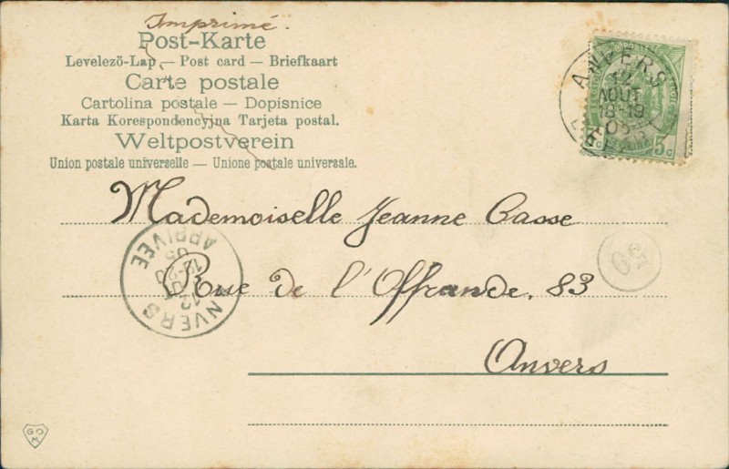 Alte Ansichtskarte, gelaufen am 12.08.1905 von Anvers nach Anvers. Ankunft in Anvers am 12.08.1905.