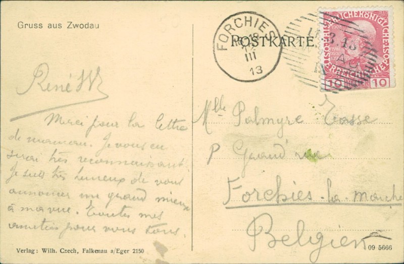 Alte Ansichtskarte aus Zwodau / Svatava, gelaufen am 11.03.1913 von Zwodau nach Forchies.