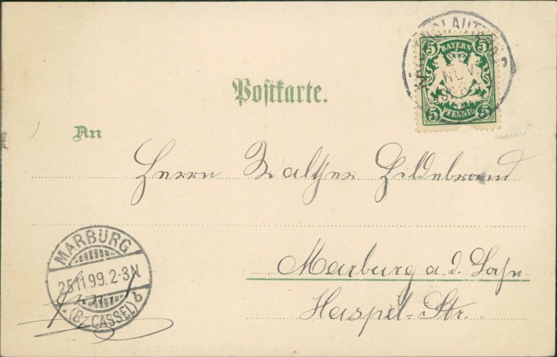 Alte Ansichtskarte aus Kaiserslautern, gelaufen am 25.11.1899 von Kaiserslautern nach Marburg. Ankunft in Marburg am 25.11.1899.