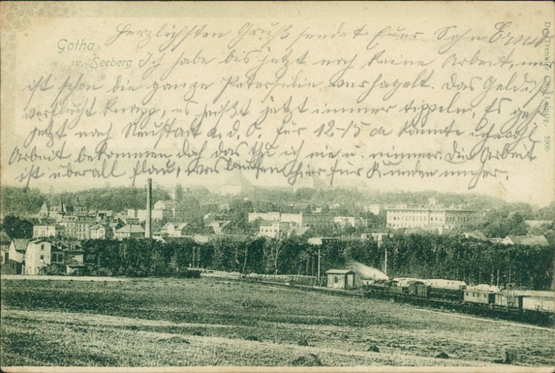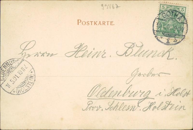 Alte Ansichtskarte aus Gotha, gelaufen am 15.05.1901 von Gotha nach Oldenburg (Holstein). Ankunft in Oldenburg (Holstein) am 16.05.1901.
