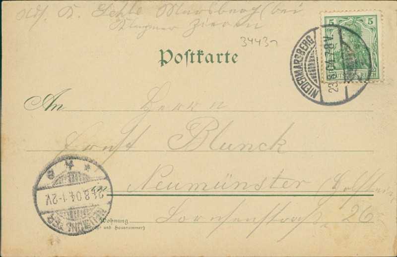 Alte Ansichtskarte aus Marsberg-Bredelar, gelaufen am 23.08.1904 von Niedermarsberg nach Neumünster. Ankunft in Neumünster am 24.08.1904.