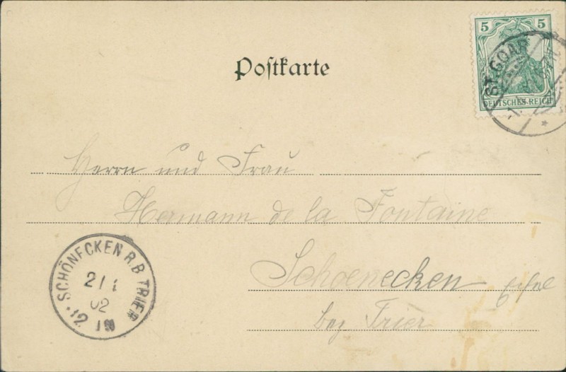Alte Ansichtskarte aus Sankt Goar, gelaufen am 01.04.1902 von St. Goar nach Schoenecken. Ankunft in Schoenecken am 02.04.1902.