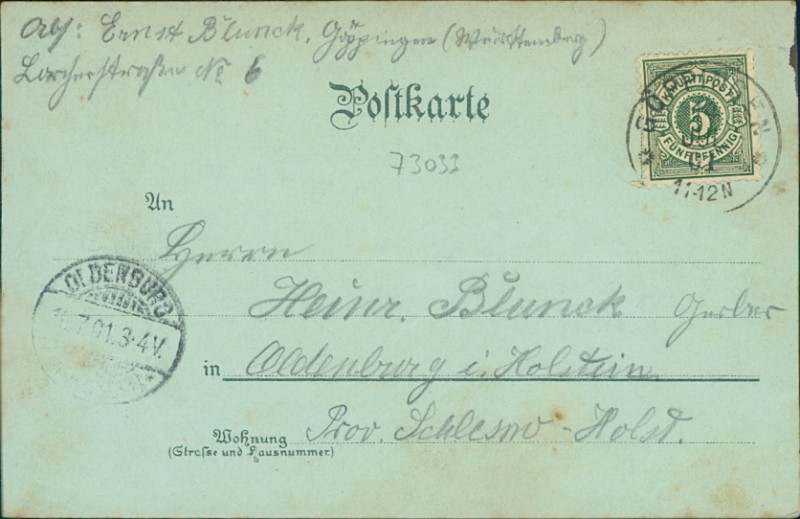 Alte Ansichtskarte, gelaufen am 14.07.1901 von Göppingen nach Oldenburg (Holstein). Ankunft in Oldenburg (Holstein) am 15.07.1901.