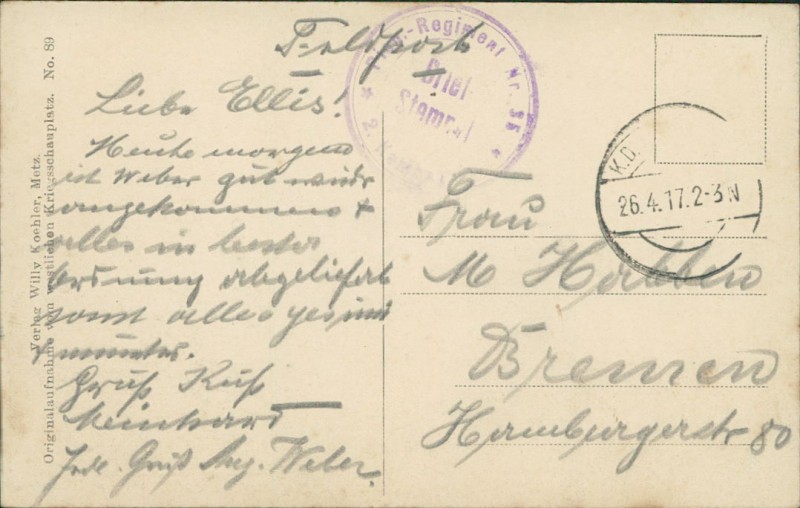 Alte Ansichtskarte aus Jaulny, gelaufen am 26.04.1917.
