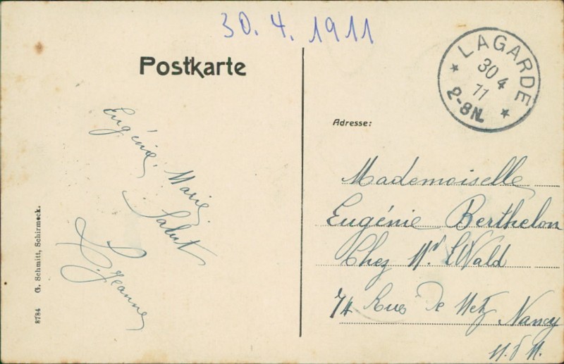Alte Ansichtskarte aus Lagarde, gelaufen am 30.04.1911 von Lagarde nach Nancy.