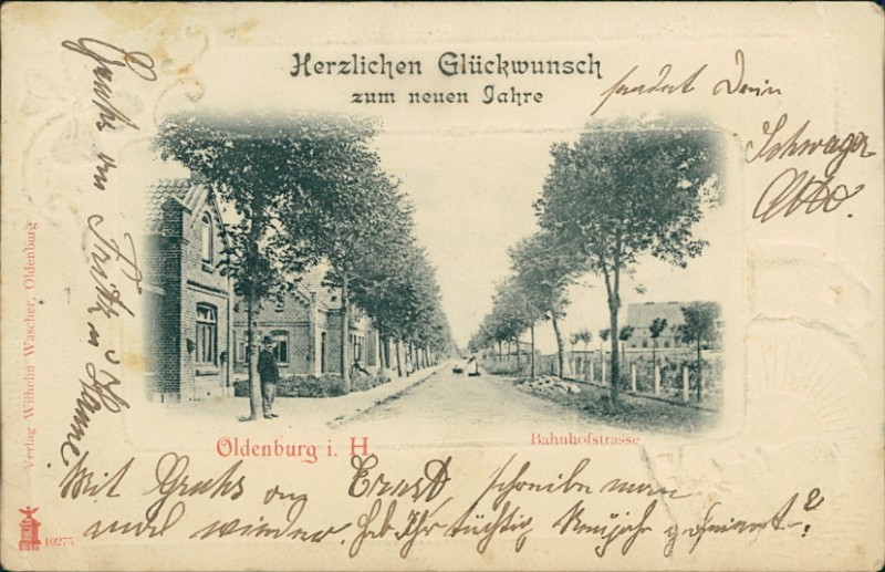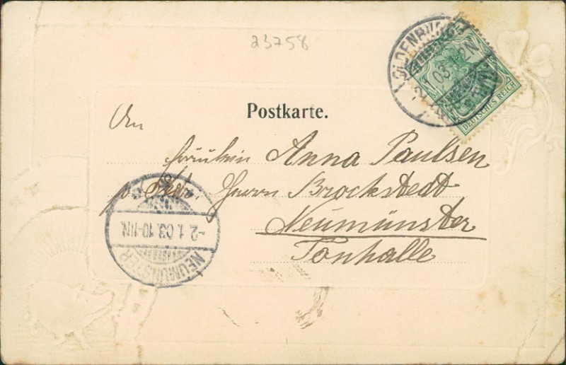 Alte Ansichtskarte aus Oldenburg in Holstein, gelaufen am 02.01.1903 von Oldenburg (Holstein) nach Neumünster. Ankunft in Neumünster am 02.01.1903.