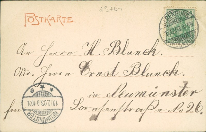 Alte Ansichtskarte aus Eutin, gelaufen am 18.12.1903 von Oldenburg (Holstein) nach Neumünster. Ankunft in Neumünster am 19.12.1903.