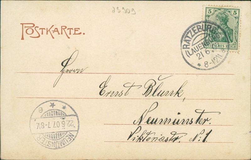 Alte Ansichtskarte aus Ratzeburg, gelaufen am 21.06.1907 von Ratzeburg (Lauenburg) nach Neumünster. Ankunft in Neumünster am 22.06.1907.