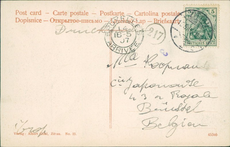 Alte Ansichtskarte aus Zittau, gelaufen am 13.05.1907 von Zittau nach Bruxelles. Ankunft in Bruxelles am 14.05.1907.